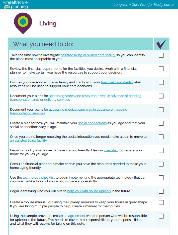 When the questionnaire is finished, a customized Proactive Aging Plan will be generated that includes personalized health care cost estimates and a customized task list.