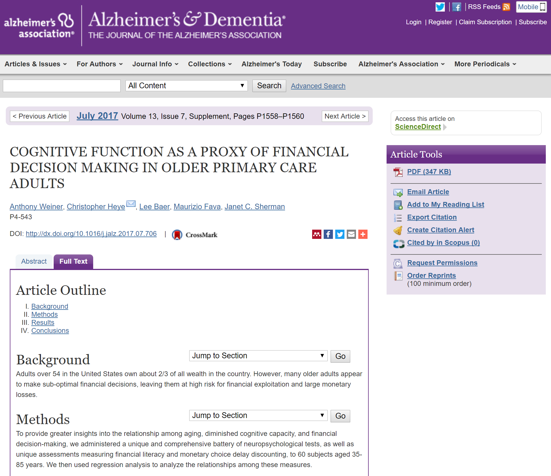 The aim of the study was to better understand the relationships among aging, cognitive impairment, and financial decision-making. As part of the study, we administered a unique and comprehensive battery of neuropsychological tests, as well as unique assessments measuring financial literacy and monetary choice delay discounting, to subjects aged 35-85 years.